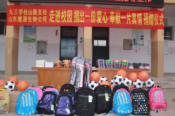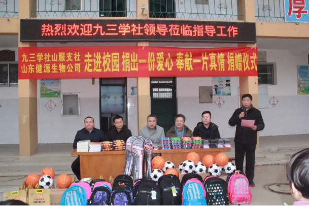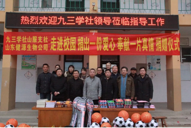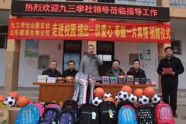 人生之善莫過于助人,助人之德莫過于助學(xué),為積極履行社會責(zé)任,關(guān)注支持貧困地區(qū)教育事業(yè)發(fā)展,2019年1月11日,九三學(xué)社與山東健源生物科技有限公司共同為泰安市高新區(qū)化馬灣鄉(xiāng)當(dāng)?shù)匾患倚W(xué)捐贈了一批體育器材、學(xué)習(xí)用品及辦公用品,為該校師生送去了社會的關(guān)心和溫暖。