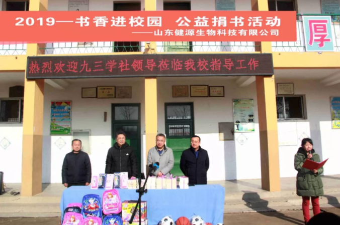 一本書傳遞一份愛,一份愛成就一個(gè)夢想,一個(gè)夢想讓無限希望起航,愛心就像一個(gè)蒲公英,和著暖陽來到了校園。元旦將至,歲寒情深,2019年12月27日,九三學(xué)社與山東健源生物科技有限公司共同為泰安市高新區(qū)化馬灣小學(xué)捐贈(zèng)了一批書籍、學(xué)習(xí)用品和體育器材,為學(xué)生和老師們送去社會(huì)的關(guān)心、關(guān)懷和關(guān)愛。