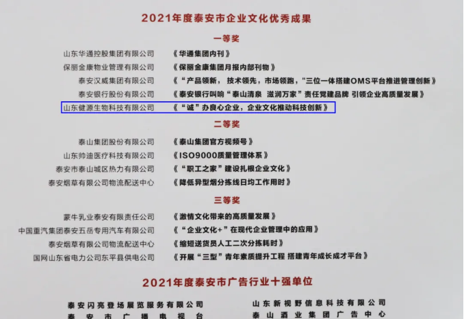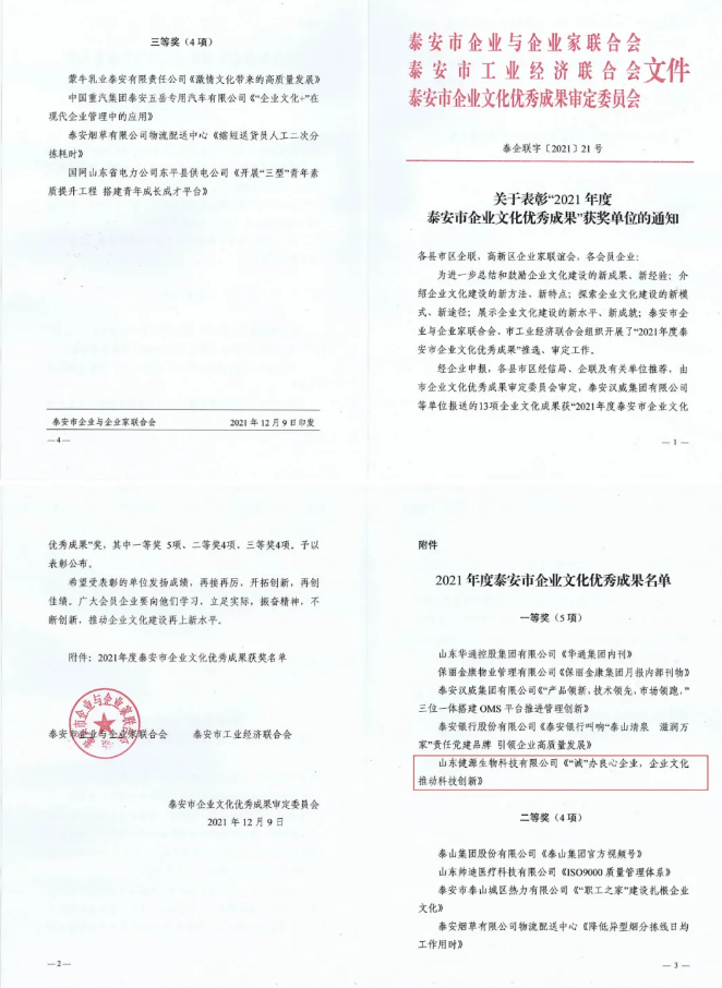 熱烈祝賀山東健源生物榮獲2021年度泰安市企業(yè)文化優(yōu)秀成果一等獎、山東省企業(yè)文化優(yōu)秀成果二等獎