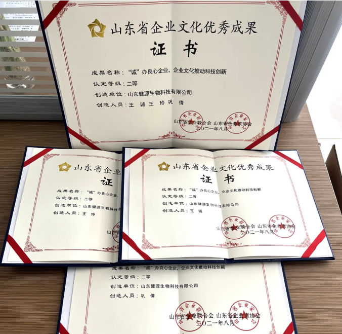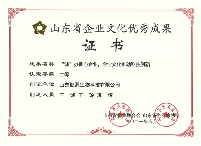 2021年8月,山東省企業(yè)聯(lián)合會、山東省企業(yè)家協(xié)會發(fā)布《關(guān)于公布首屆山東省企業(yè)文化優(yōu)秀成果的通知》,山東健源生物科技有限公司報送的““誠”辦良心企業(yè),企業(yè)文化推動科技創(chuàng)新”企業(yè)文化建設(shè)成果榮獲首屆山東省企業(yè)文化優(yōu)秀成果二等獎。