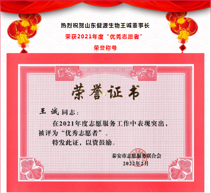 熱烈祝賀山東健源生物王誠董事長榮獲2021年度“志愿者”榮譽稱號