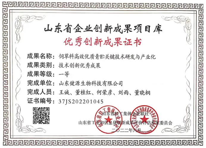 發(fā)布時間:[2022-7-15 11:33:13] 瀏覽量:4108次根據(jù)山東省輕工集體企業(yè)聯(lián)社發(fā)布《關(guān)于公布企業(yè)技術(shù)創(chuàng)新成果項目的通知 》(魯輕聯(lián)企[2022]18號),經(jīng)各市中小企業(yè)主管部門、行業(yè)協(xié)會、服務(wù)機構(gòu)初審,專家評審,公示和異議復核等程序,山東健源生物科技有限公司提報的《飼草料優(yōu)質(zhì)青貯關(guān)鍵技術(shù)研發(fā)與產(chǎn)業(yè)化》成果榮獲山東省企業(yè)創(chuàng)新成果項目庫 “技術(shù)創(chuàng)新優(yōu)秀成果一等獎”。