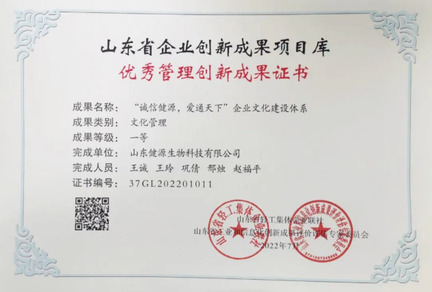 山東健源生物榮獲山東省企業(yè)創(chuàng)新成果項目庫優(yōu)秀管理創(chuàng)新成果一等獎
