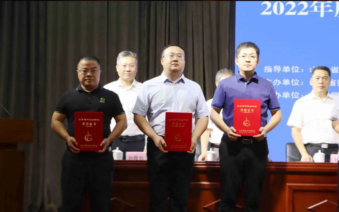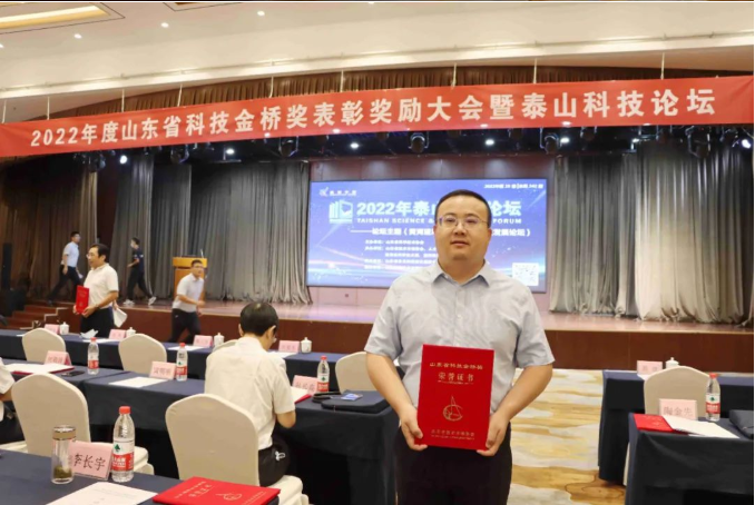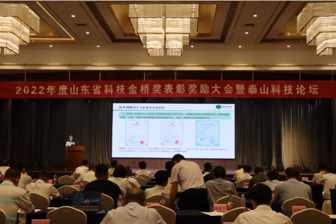 2022年8月11日,2022年度山東省科技金橋獎(jiǎng)表彰獎(jiǎng)勵(lì)大會(huì)暨泰山科技論壇在淄博高青舉行。會(huì)議現(xiàn)場(chǎng)為項(xiàng)目頒獎(jiǎng),經(jīng)過(guò)專業(yè)組評(píng)審、評(píng)審委員會(huì)評(píng)審、獎(jiǎng)勵(lì)委員會(huì)終審,決定授予山東健源生物科技有限公司項(xiàng)目為山東省科技金橋獎(jiǎng)項(xiàng)目二等獎(jiǎng),山東健源生物王誠(chéng)董事長(zhǎng)作為項(xiàng)目完成人上臺(tái)領(lǐng)獎(jiǎng)。