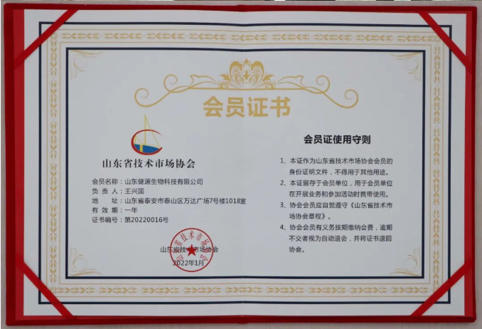 山東健源生物科技有限公司成為山東省技術(shù)市場(chǎng)協(xié)會(huì)會(huì)員單位