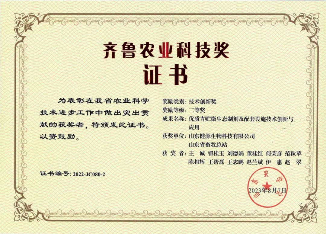 山東健源生物科技有限公司作為第一完成單位申報(bào)的“優(yōu)質(zhì)青貯微生態(tài)制劑及配套設(shè)施技術(shù)創(chuàng)新與應(yīng)用”項(xiàng)目榮獲2022年度齊魯農(nóng)業(yè)科技獎(jiǎng)技術(shù)創(chuàng)新獎(jiǎng)二等獎(jiǎng)。