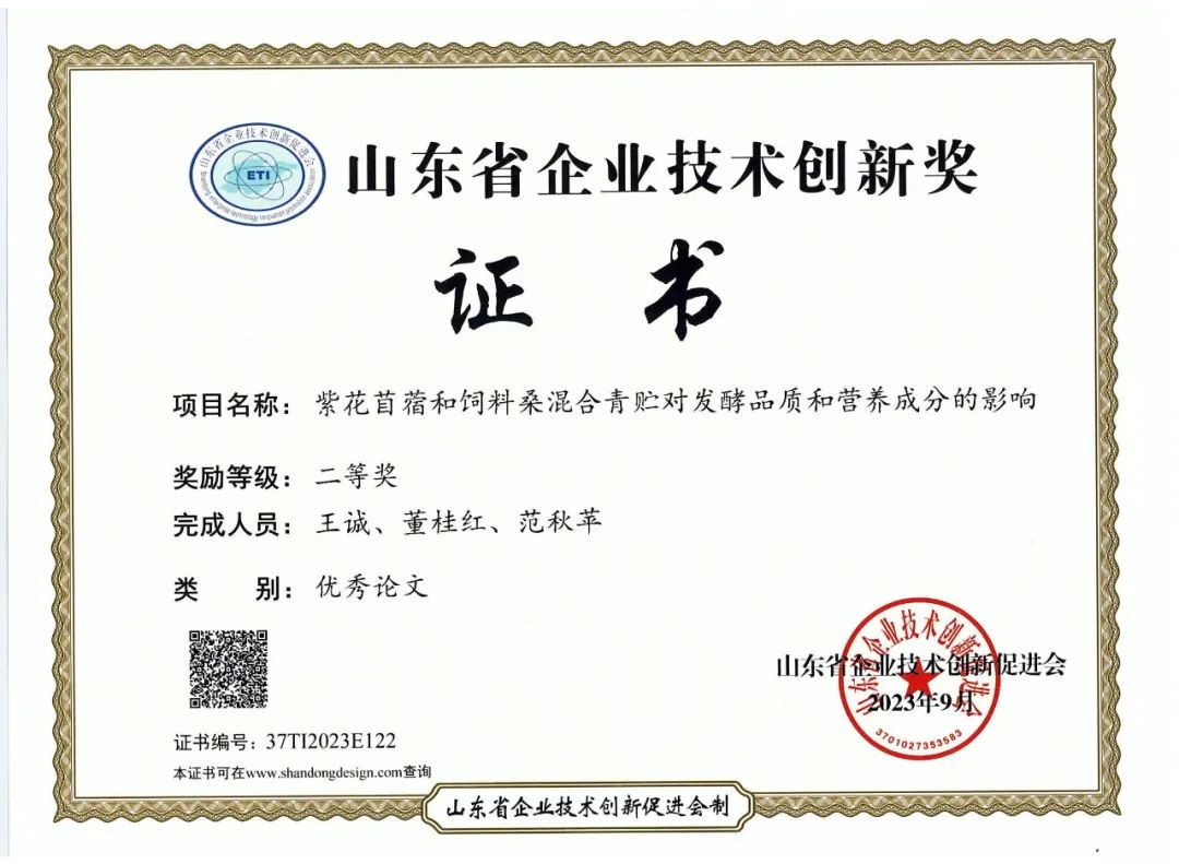 《紫花苜蓿和飼料;旌锨噘A對(duì)發(fā)酵品質(zhì)和營養(yǎng)成分的影響》榮獲山東省企業(yè)技術(shù)創(chuàng)新獎(jiǎng)優(yōu)秀論文二等獎(jiǎng)