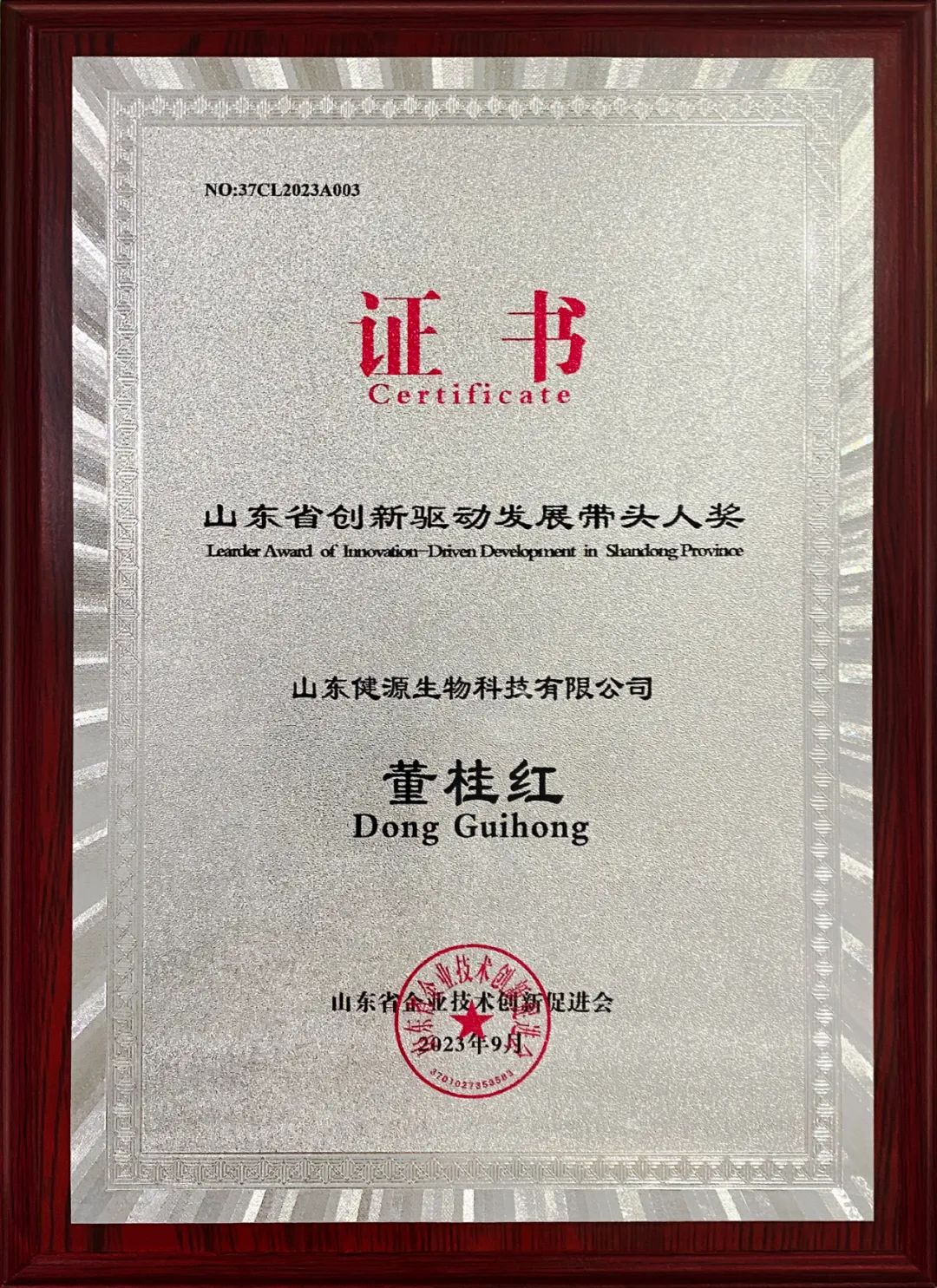 山東健源生物科技有限公司榮獲山東省創(chuàng)新驅(qū)動(dòng)發(fā)展獎(jiǎng)突出貢獻(xiàn)單位