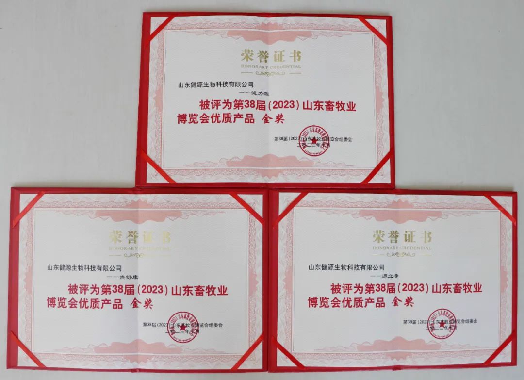 會(huì)上對(duì)獲獎(jiǎng)單位進(jìn)行頒獎(jiǎng),健源生物產(chǎn)品“健力源”、“源立凈”、“熱舒康”,均被評(píng)為第38屆(2023)山東畜牧業(yè)博覽會(huì)優(yōu)質(zhì)產(chǎn)品金獎(jiǎng)。