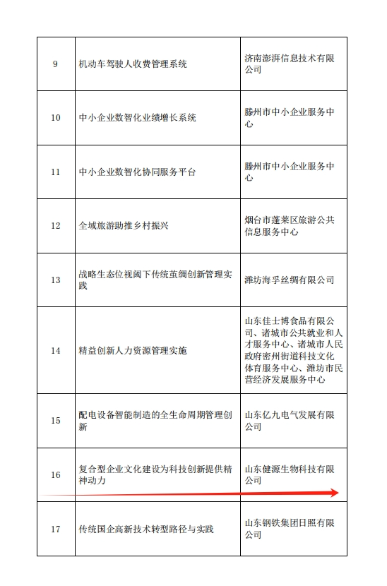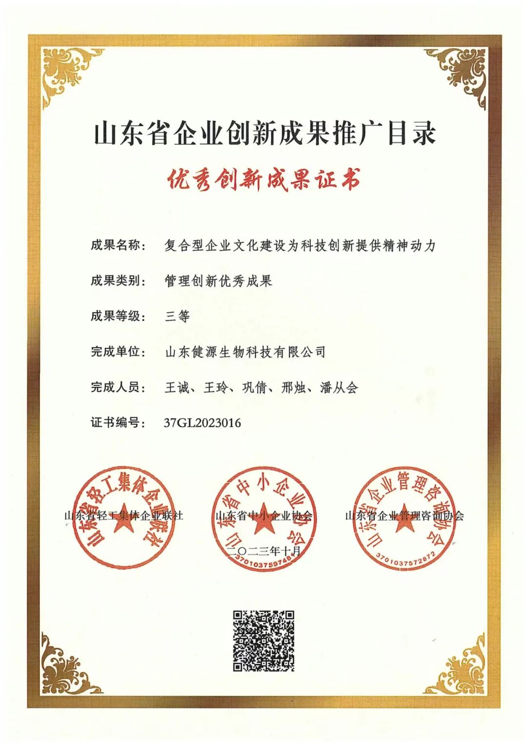 近日,山東省輕工集體企業(yè)聯(lián)社公布了《2023年企業(yè)創(chuàng)新優(yōu)秀成果推廣目錄名單》。山東健源生物科技有限公司的“復合型企業(yè)文化建設為科技創(chuàng)新提供精神動力”榮獲管理創(chuàng)新優(yōu)秀成果證書,并成功入選了山東省企業(yè)創(chuàng)新成果推廣目錄。