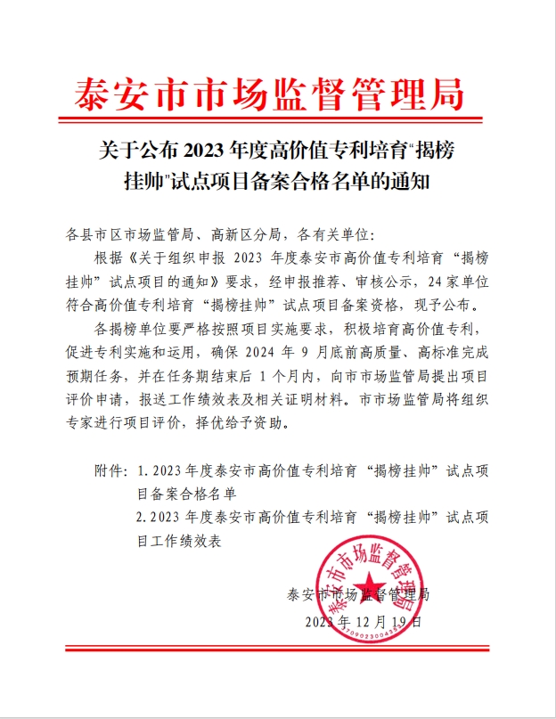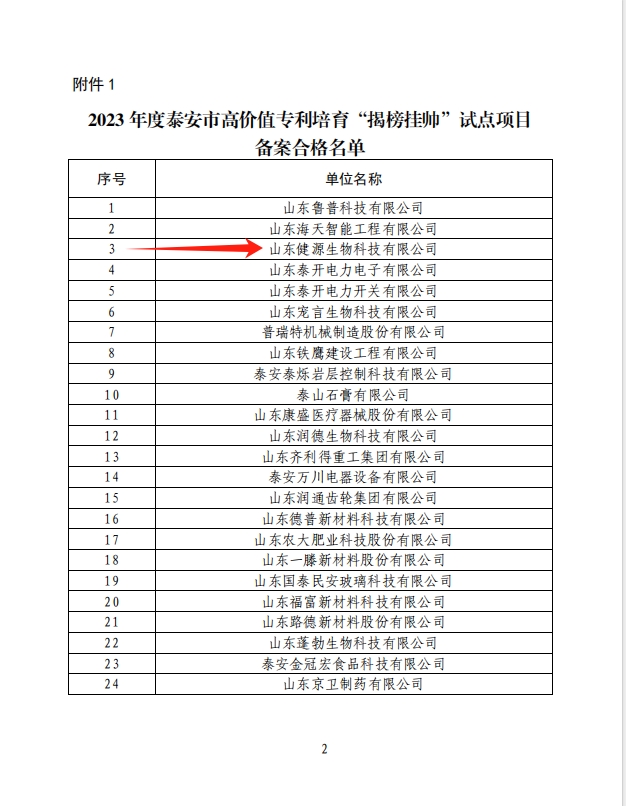 日前,泰安市市場監(jiān)督管理局根據(jù)《關(guān)于組織申報(bào)2023年度泰安市高價(jià)值專利培育“揭榜掛帥”試點(diǎn)項(xiàng)目的通知》要求,經(jīng)過申報(bào)推薦、審核公示,我市24家單位符合備案資格。山東健源生物科技有限公司成功入選2023年度高價(jià)值專利培育“揭榜掛帥”試點(diǎn)項(xiàng)目備案合格名單。