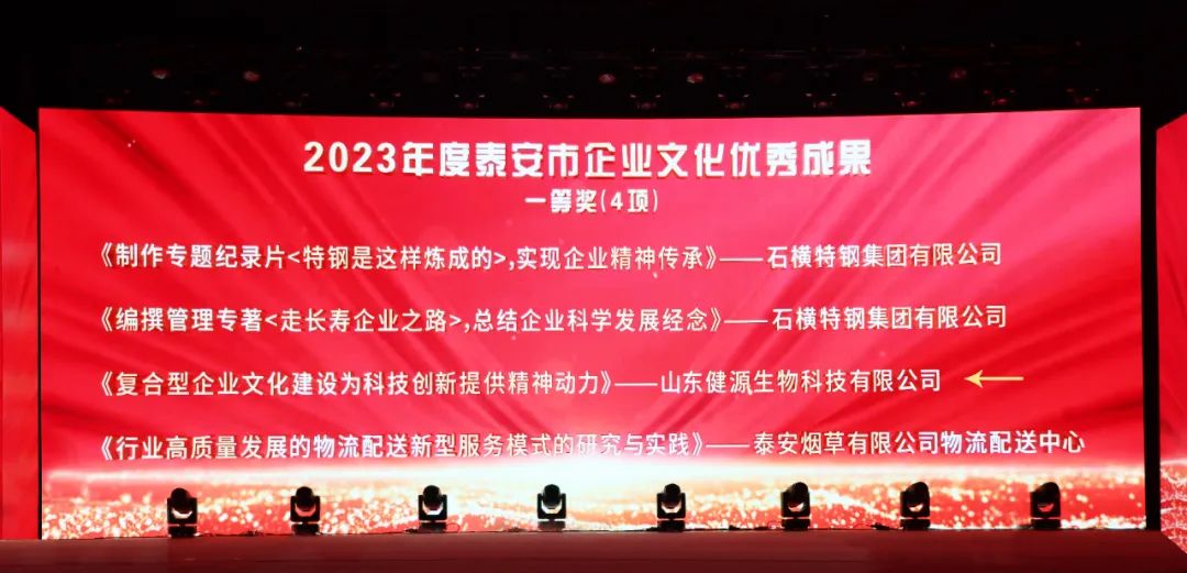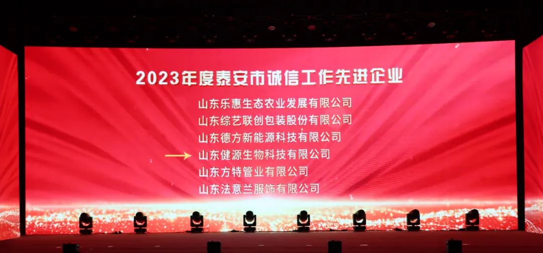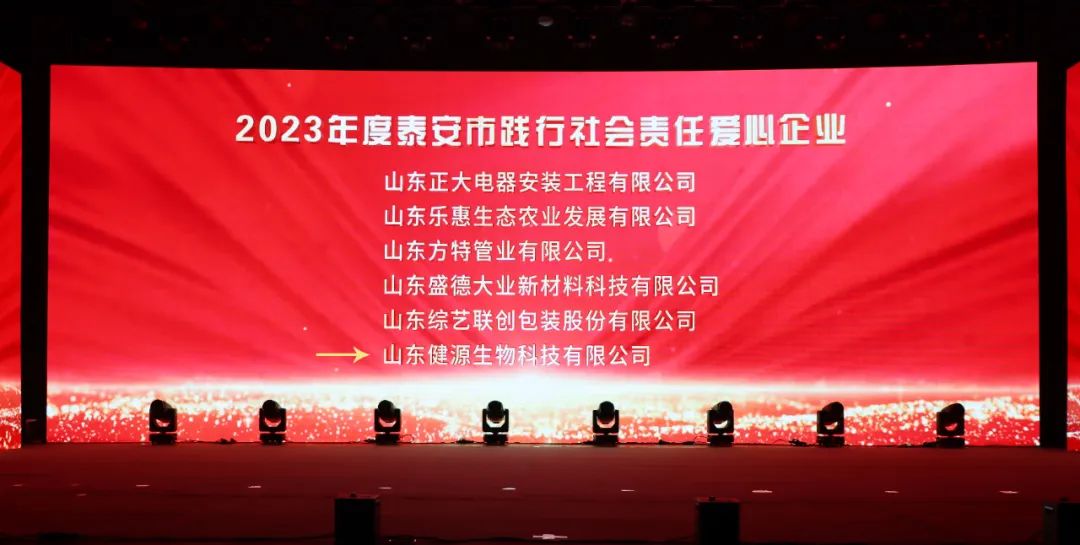 12月29日,2023迎新年銀企聯(lián)誼會(huì)暨2023年泰山企業(yè)家、泰安市“誠(chéng)信工作先進(jìn)企業(yè)”、 泰安市踐行社會(huì)責(zé)任愛(ài)心企業(yè)頒獎(jiǎng)盛典隆重舉行。大會(huì)總結(jié)交流全市推進(jìn)新型工業(yè)化和企業(yè)創(chuàng)新發(fā)展的成就與經(jīng)驗(yàn),表彰先進(jìn)。山東健源生物科技有限公司榮獲“泰安市企業(yè)文化優(yōu)秀成果一等獎(jiǎng)”、“泰安市誠(chéng)信工作先進(jìn)企業(yè)”、“泰安市踐行社會(huì)責(zé)任愛(ài)心企業(yè)”榮譽(yù)稱號(hào)。