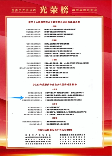 為進(jìn)一步總結(jié)交流企業(yè)文化建設(shè)的新成果、新經(jīng)驗(yàn),介紹企業(yè)文化建設(shè)的新方法、新特點(diǎn),展示企業(yè)文化建設(shè)的新水平、新成就,經(jīng)市企業(yè)文化優(yōu)秀成果評(píng)委會(huì)審定,全市10項(xiàng)企業(yè)文化成果獲“2023年度泰安市企業(yè)文化優(yōu)秀成果”獎(jiǎng),其中,一等獎(jiǎng)4項(xiàng)。
