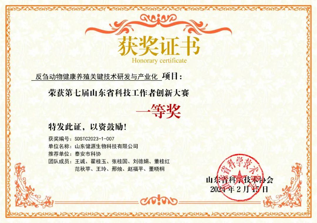 由山東健源生物科技有限公司申報,泰安市科協(xié)推薦的《反芻動物健康養(yǎng)殖關(guān)鍵技術(shù)研發(fā)與產(chǎn)業(yè)化》項目榮獲第七屆山東省科技工作者創(chuàng)新大賽一等獎。