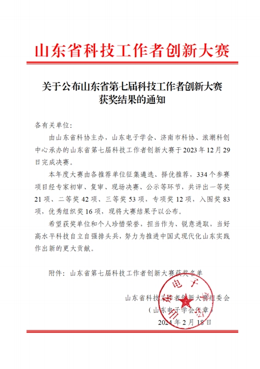 由山東省科協(xié)主辦,山東電子學(xué)會、濟南市科協(xié)、浪潮科創(chuàng)中心承辦的山東省第七屆科技工作者創(chuàng)新大賽于2023年12月29日完成決賽。本年度大賽由各市科協(xié)、省級學(xué)會、高校科協(xié)、院士工作站等征集遴選、擇優(yōu)推薦的334項參賽項目,經(jīng)專家初審、復(fù)審、現(xiàn)場決賽、公示等環(huán)節(jié),共評出一等獎21項,二等獎42項,三等獎53項,專項獎12項,入圍獎83項,優(yōu)秀組織獎16項。