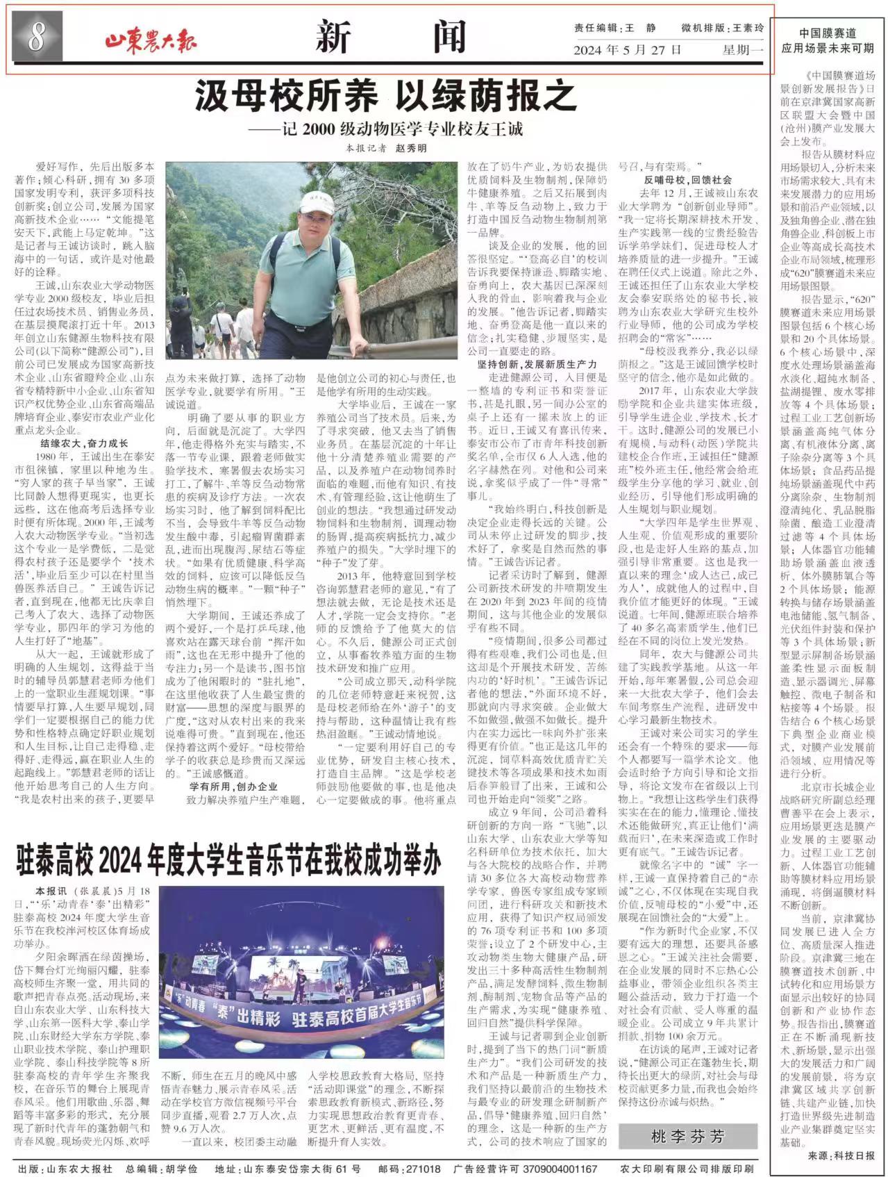 發(fā)布時(shí)間:[2024-6-1 17:23:41] 瀏覽量:2899次日前,王誠(chéng)董事長(zhǎng)作為山東農(nóng)業(yè)大學(xué)校友接受《山東農(nóng)大報(bào)》桃李芬芳欄目采訪。報(bào)道發(fā)表在《山東農(nóng)大報(bào)》第1447期第8版,講述了王誠(chéng)董事長(zhǎng)求學(xué)創(chuàng)業(yè)之路,以實(shí)際行動(dòng)反哺母校,先后被山東農(nóng)業(yè)大學(xué)聘為“創(chuàng)新創(chuàng)業(yè)導(dǎo)師”和“研究生校外行業(yè)導(dǎo)師”,擔(dān)任山東畜牧獸醫(yī)學(xué)會(huì)副理事長(zhǎng)、山東畜牧獸醫(yī)學(xué)會(huì)反芻動(dòng)物科技專業(yè)委員會(huì)秘書(shū)長(zhǎng)、副理事長(zhǎng)。2023年被聘請(qǐng)為山東農(nóng)業(yè)大學(xué)校友會(huì)泰安聯(lián)絡(luò)處理事會(huì)秘書(shū)長(zhǎng),并被授予“優(yōu)秀校友工作者”榮譽(yù)稱號(hào),健源生物是山東農(nóng)業(yè)大學(xué)“校友之家”單位、動(dòng)物科技學(xué)院“教育科研實(shí)踐就業(yè)基地”。