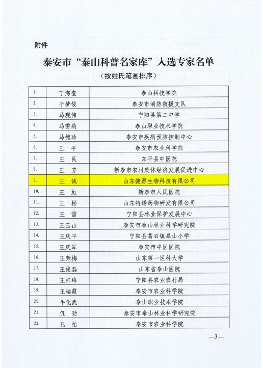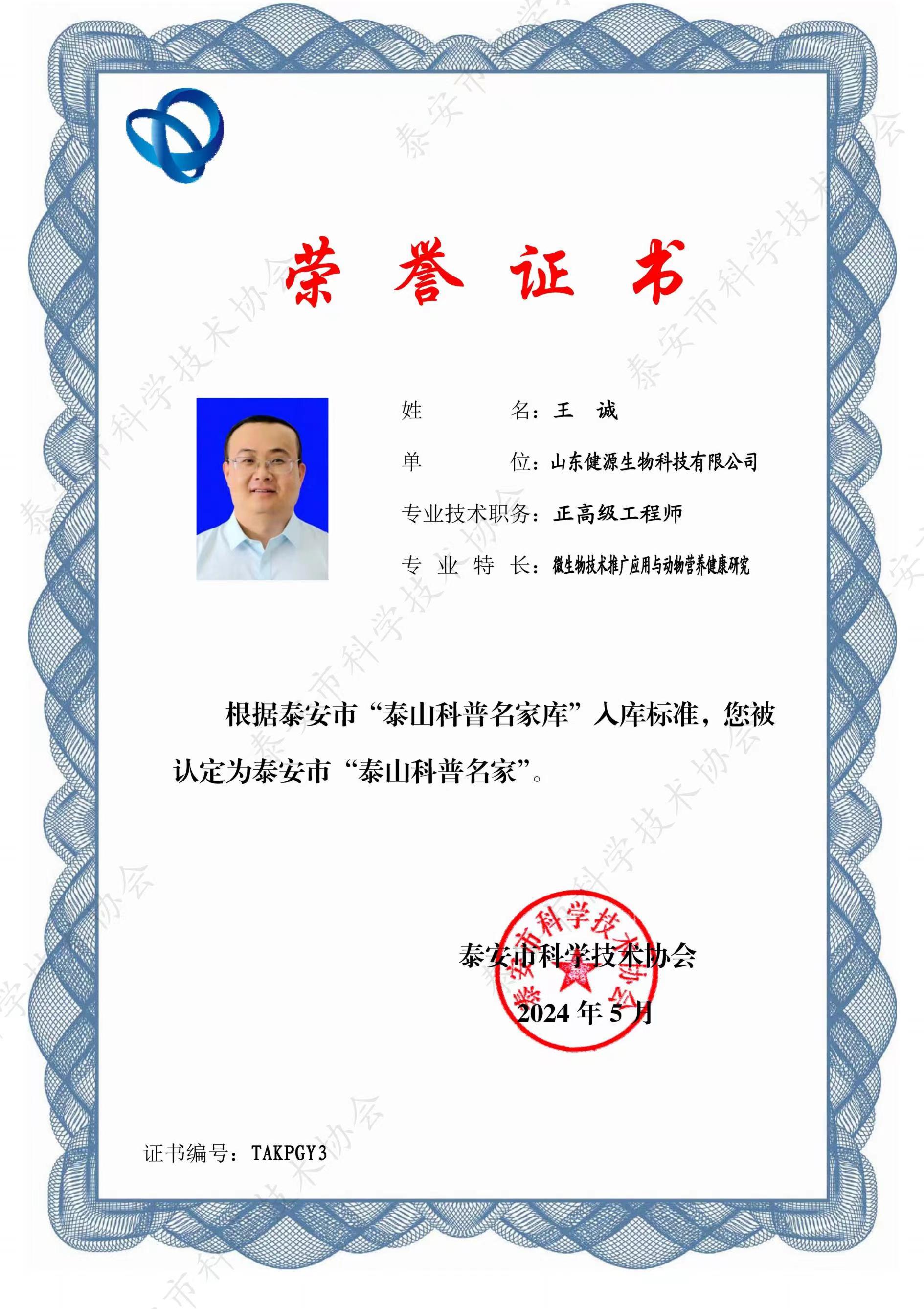 發(fā)布時間:[2024-6-6 16:33:30] 瀏覽量:2819次近日,泰安市科學技術協(xié)會公布了泰安市“泰山科普名家?guī)臁比脒x專家名單,根據(jù)泰安市“泰山科普名家?guī)臁比霂鞓藴剩?/span>山東健源生物科技有限公司董事長王誠被認定為泰安市“泰山科普名家”。