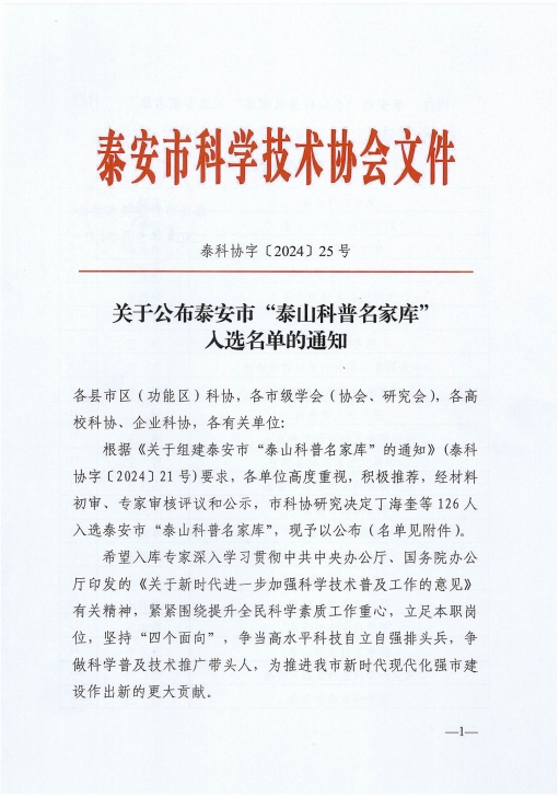 根據(jù)《關于組建泰安市“泰山科普名家?guī)臁钡耐ㄖ?泰科協(xié)字[2024]21號)要求,泰安市“泰山科普名家?guī)臁痹u選工作經(jīng)過材料初審、專家審核評議和公示等環(huán)節(jié),最終,126人入選泰安市“泰山科普名家?guī)臁薄?/span>