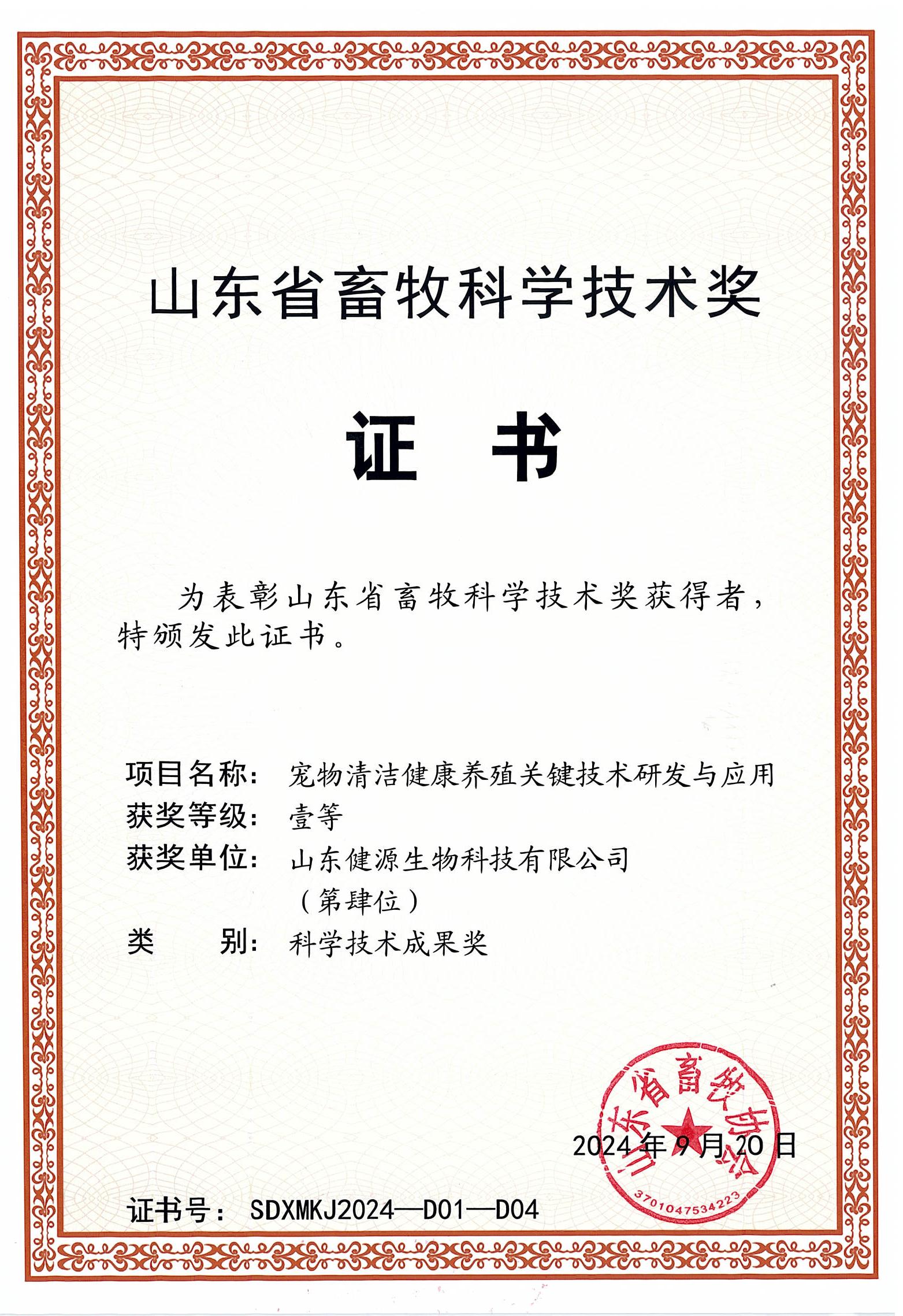 山東健源生物科技有限公司與子公司山東寵言生物科技有限公司共同完成的“寵物清潔健康養(yǎng)殖關(guān)鍵技術(shù)研發(fā)與應(yīng)用”項(xiàng)目,憑借其創(chuàng)新性與實(shí)用性,榮獲山東省畜牧科學(xué)技術(shù)獎(jiǎng)科學(xué)技術(shù)成果獎(jiǎng)一等獎(jiǎng)。