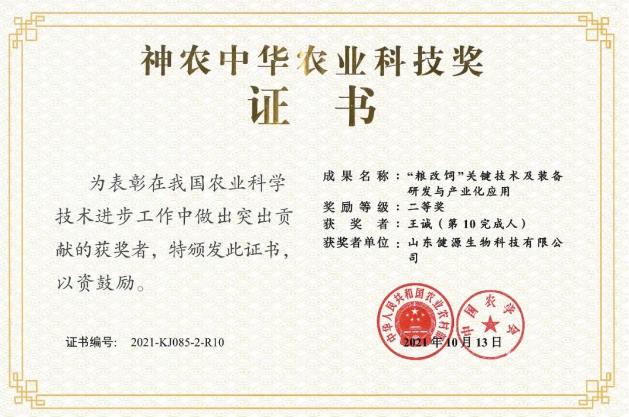 2022-3-7 祝賀山東健源生物及王誠(chéng)董事長(zhǎng)榮獲神農(nóng)中華農(nóng)業(yè)科技獎(jiǎng)科學(xué)研究類成果“二等獎(jiǎng)”