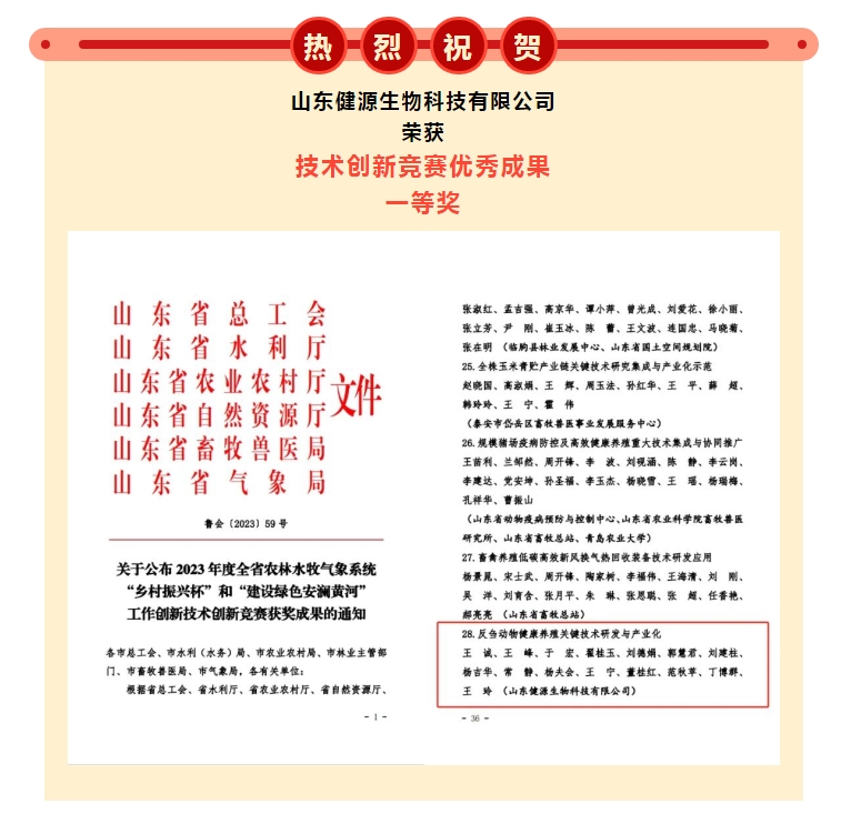 2024-1-23 健源生物榮獲2023年度全省技術(shù)創(chuàng)新競(jìng)賽優(yōu)秀成果一等獎(jiǎng)