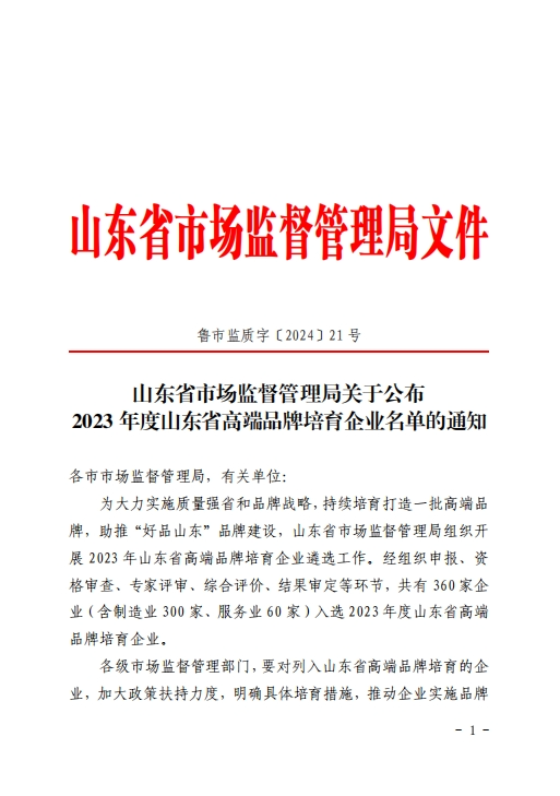 1月26日,山東省市場(chǎng)監(jiān)督管理局發(fā)布《關(guān)于公布2023年度山東省高端品牌培育企業(yè)名單的通知》,山東健...