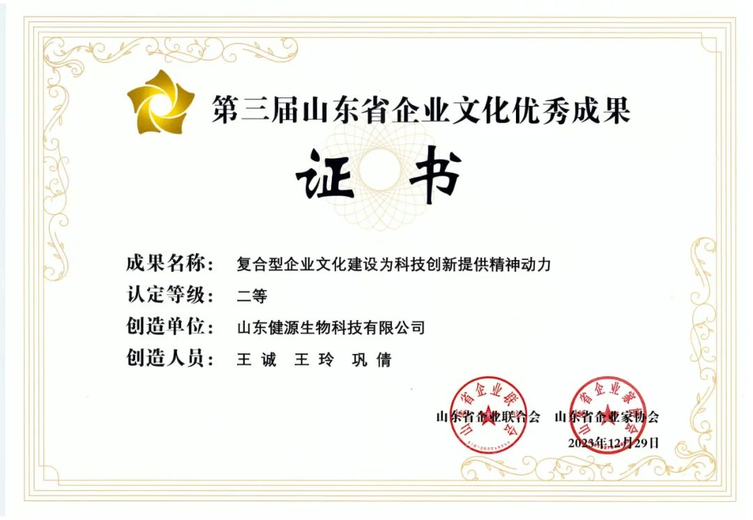 熱烈祝賀 山東健源生物科技有限公司 榮獲 第三屆山東省企業(yè)文化優(yōu)秀成果 二等獎(jiǎng) 1月23日-...