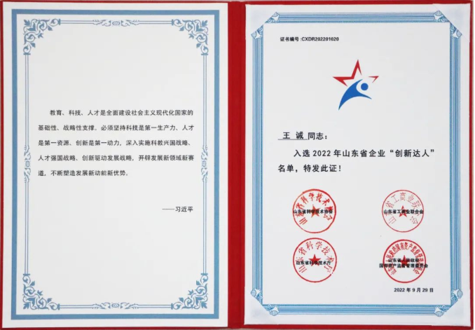 2022-11-24 祝賀山東健源生物董事長王誠榮獲2022年山東省企業(yè)“創(chuàng)新達人”稱號