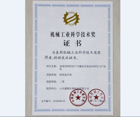 祝賀山東健源生物參與完成的《高效飼草料生產(chǎn)關(guān)鍵技術(shù)裝備的研發(fā)與產(chǎn)業(yè)化》項(xiàng)目榮獲2022年度機(jī)械工業(yè)科學(xué)技術(shù)獎(jiǎng)科技進(jìn)步獎(jiǎng)二等獎(jiǎng)